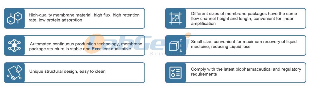 LABGENI offers six sizes of TFF membrane cassettes, all with identical flow channel lengths and heights, facilitating linear scale-up and suitable for laboratory, pilot, pilot, and mass production stages.