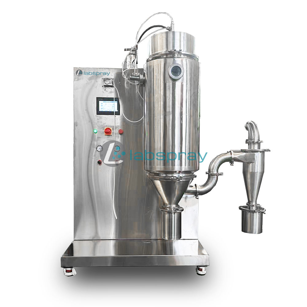 SD-1900 pilot-scale spray dryer is an innovative product through years of exploration and research. Compared to current pilot-scale spray dryers, this machine has the advantages of small volume, lower noise, low power, high recovery rate and convenient operation, which can be used in the laboratory. The whole machine occupies less than one square meter. It is configured with one button start up and the color LCD touch screen for easy operation. Also, it can run automatically or manually for monitoring in the experimental process. It generates spray particles with a diameter of 1 to 100 microns and performs excellent in drying.